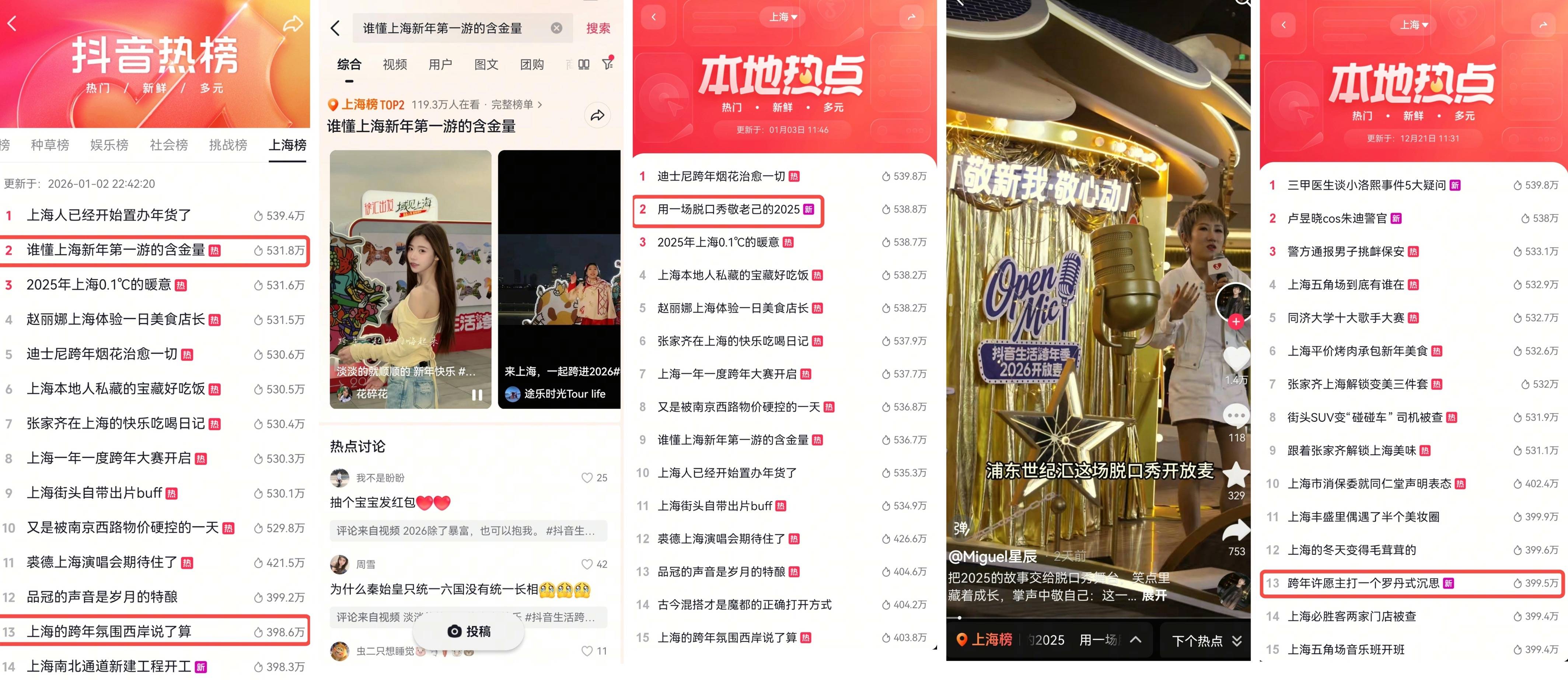 从抖音平台进入「抖音生活跨年季」主会场,完成任务解锁积分,跨年好礼天天抽不停!抖音搜索“新天地”、“外滩”、“徐家汇红包”、“龙华红包”等商圈相关信息,“5元立减券”即刻到手,直接叠加商家团购商品~“低至2折的圣诞烤鸡套餐”、“3折的宠物健康体检礼遇”、“亲友聚会松叶蟹”,还有“百元火锅代金券”等多款诚意跨年套餐现已上线,涵盖餐饮、逛街购物、亲子宠物等多元场景,一站式满足在上海跨年的消费需求。活动期间,「抖音生活跨年季」话题总播放量超过3.4亿,上海五大商圈交易总量同步提升30%,4个热点登上同城热榜总曝光超2000万。