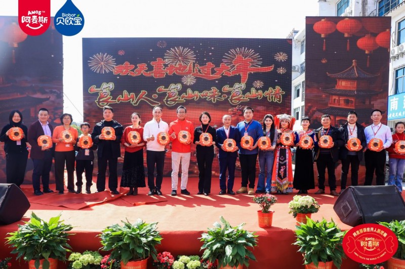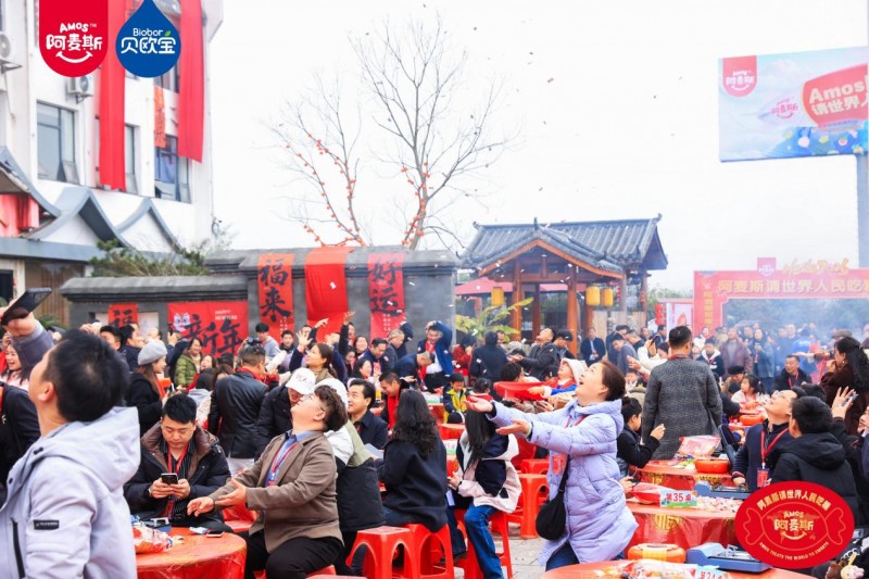 本次活动巧妙根植传统年俗,将甜蜜滋味融入烟火日常。在极具传统仪式感的 “年猪宴” 上,打糍粑、品米酒、逛民俗市集、赏非遗文化演出等特色活动轮番上演,沉浸式还原传统年味。身着民族服饰、佩戴Amos阿麦斯品牌标识的瑶族姑娘穿梭其间,向来往宾客热情派发糖果。在此起彼伏的欢呼声中,金多多食品集团无人机撒糖互动惊喜登场,将现场氛围推向一个又一个小高潮。本次无人机撒糖分多轮有序进行,共免费派发100斤糖果,将节庆的甜蜜与喜悦,悉数融化在宾客的笑容里。席间还特别设置了多轮抽奖环节,由金多多食品提供的“醒狮礼盒”、“柿柿如意”年糖礼盒接连送出,现场喜庆氛围不断升温,甜蜜滋味交织蔓延。