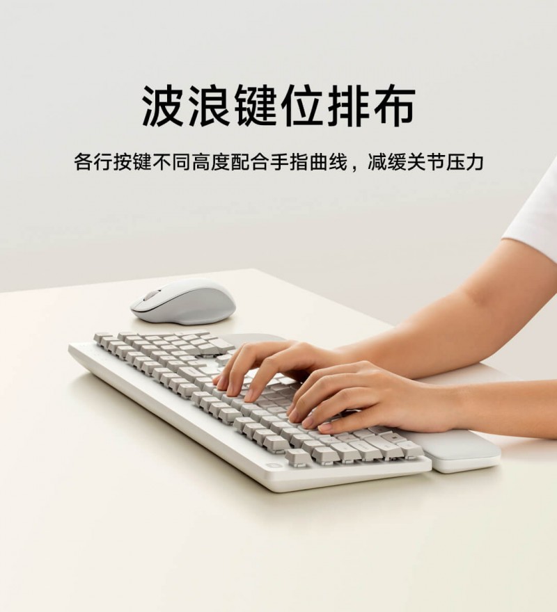 小米无线键鼠套装舒适版键盘创新采用波浪形键位设计,每一排按键依据指关节自然曲率精心排列,形成贴合指尖运动轨迹的起伏曲面,手指无需生硬适应,有效减少指关节疲劳;微弧下凹键帽,有效分散指腹压力分散;低噪音薄膜触点与适中的键程,带来轻柔触感与清晰反馈,长时间输入也是一种享受。