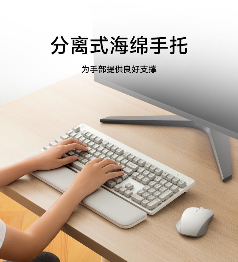 无需烧脑拼凑,小米无线键鼠套装舒适版为用户提供了完整的键鼠解决方案。键盘附带分离式PU材质手托,可自由摆放位置为手部提供支撑,表面触感细腻柔美,内部填充高弹性海绵,提供恰到好处的支撑力,确保为手部提供最自然放松的生理中立姿势。生物力学与材料科学的碰撞融合,支撑度、舒适感完美契合,显著降低腕部劳损风险,为健康办公多一份贴心守护。