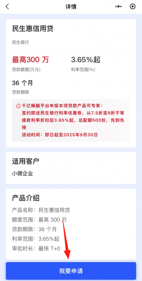 平台现协同民生银行针对小微企业推出专属优惠贷款产品“民生惠信用贷”,灵活高效解决小微企业的燃眉之急。即日起至2025年9月30日,在“千亿畅融”平台发起申请并签约民生银行即享民生银行专属7.5折至9折利率优惠券,折扣后利率3.65%起,总配额约500份,先到先得。